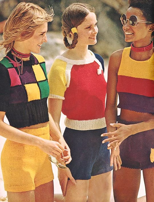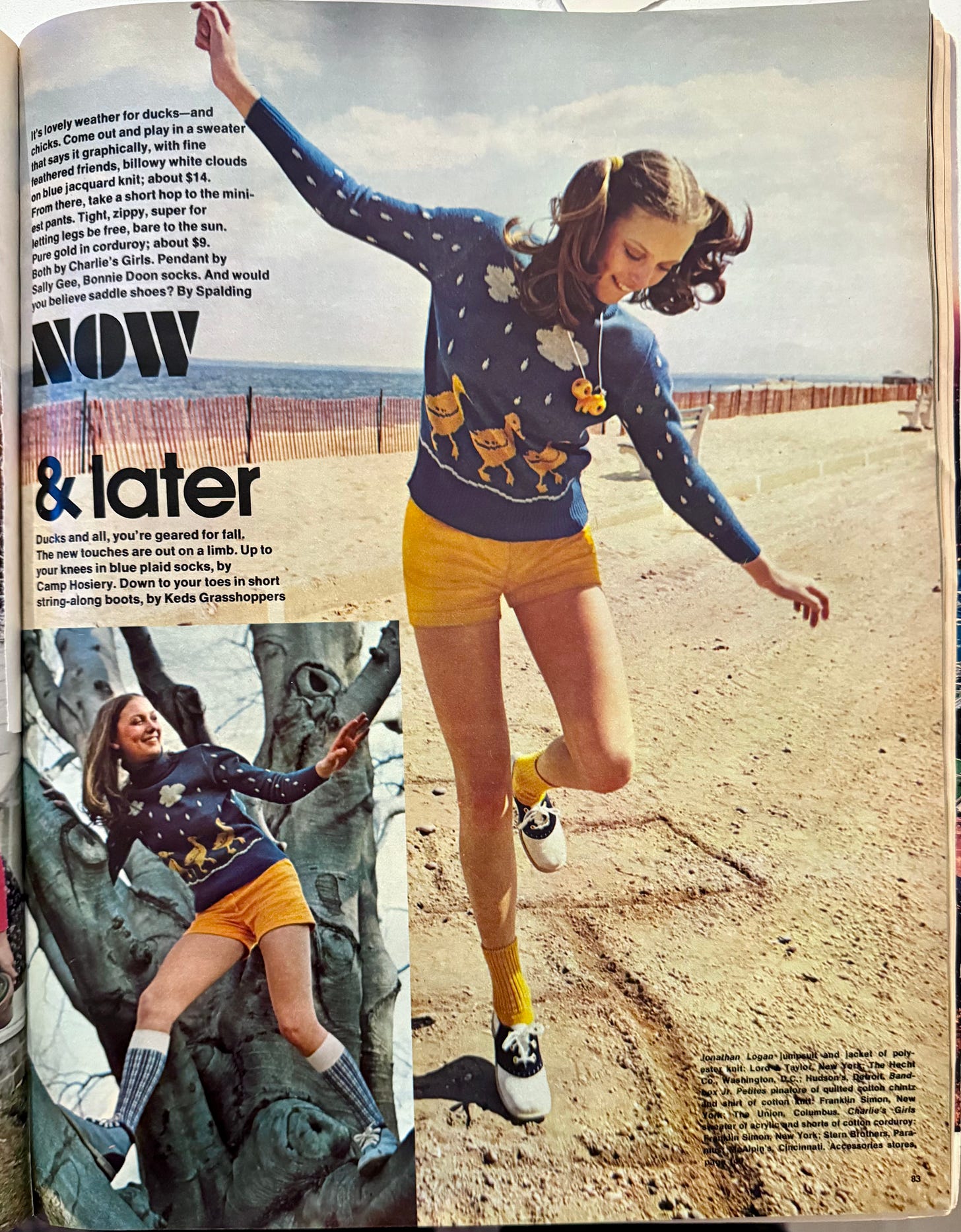 I loved the multi-colored knitwear and the fun figurative designs, and I LOVED my Spalding saddle shoes, sourced from the magazine and ordered from B.Dalton in NYC. Money from my job, well spent.