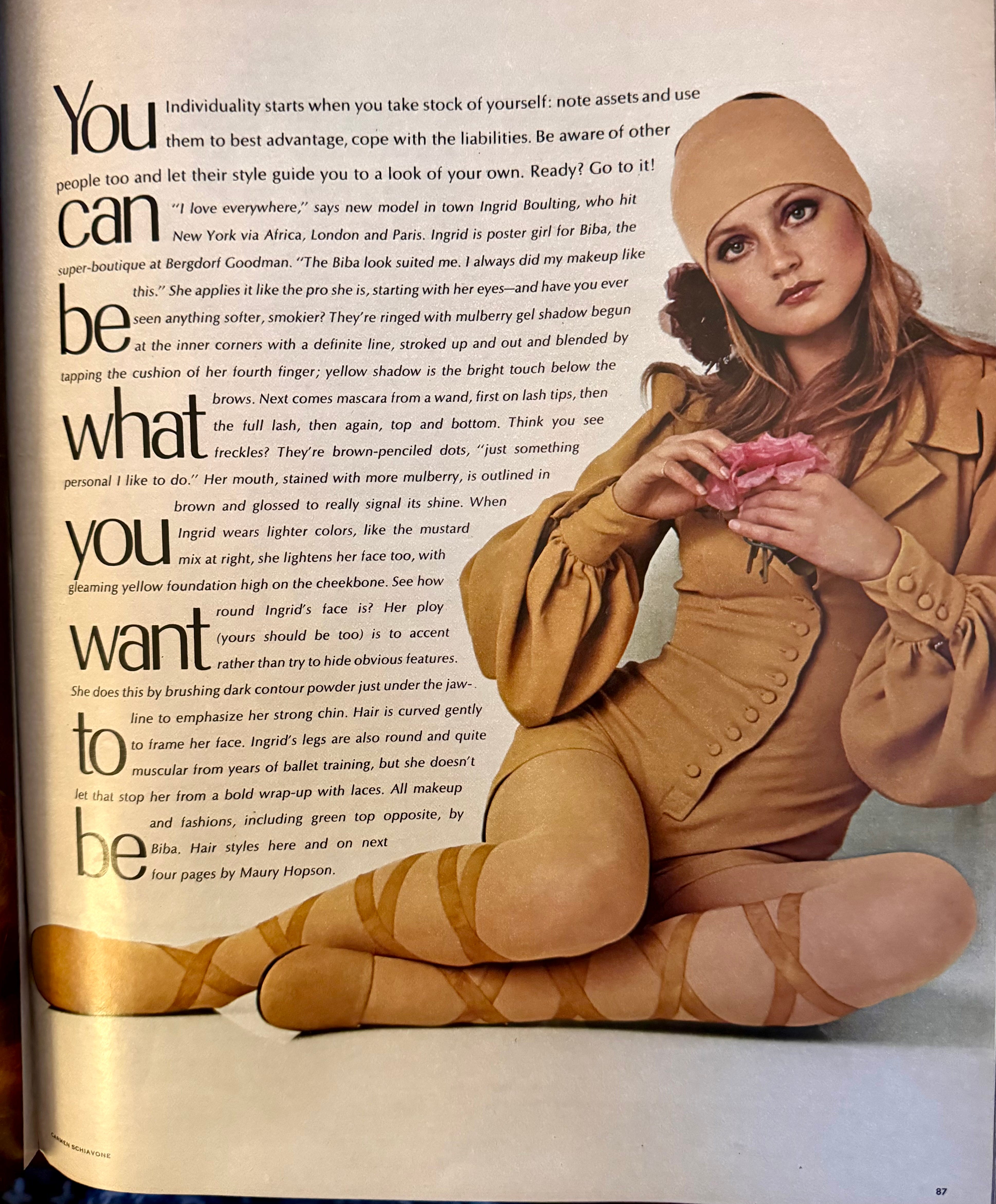 Check out this article about individuality. Those tricky writers tried to convince us that even a stunning model like Ingrid Boulting has flaws. Ingrid was the face of Biba, an iconic London fashion store. The poor thing has to use shading to make her face look less round. And you can, too! Oh no, she’s got those “round and quite muscular” legs from years of ballet training. But she doesn’t care!