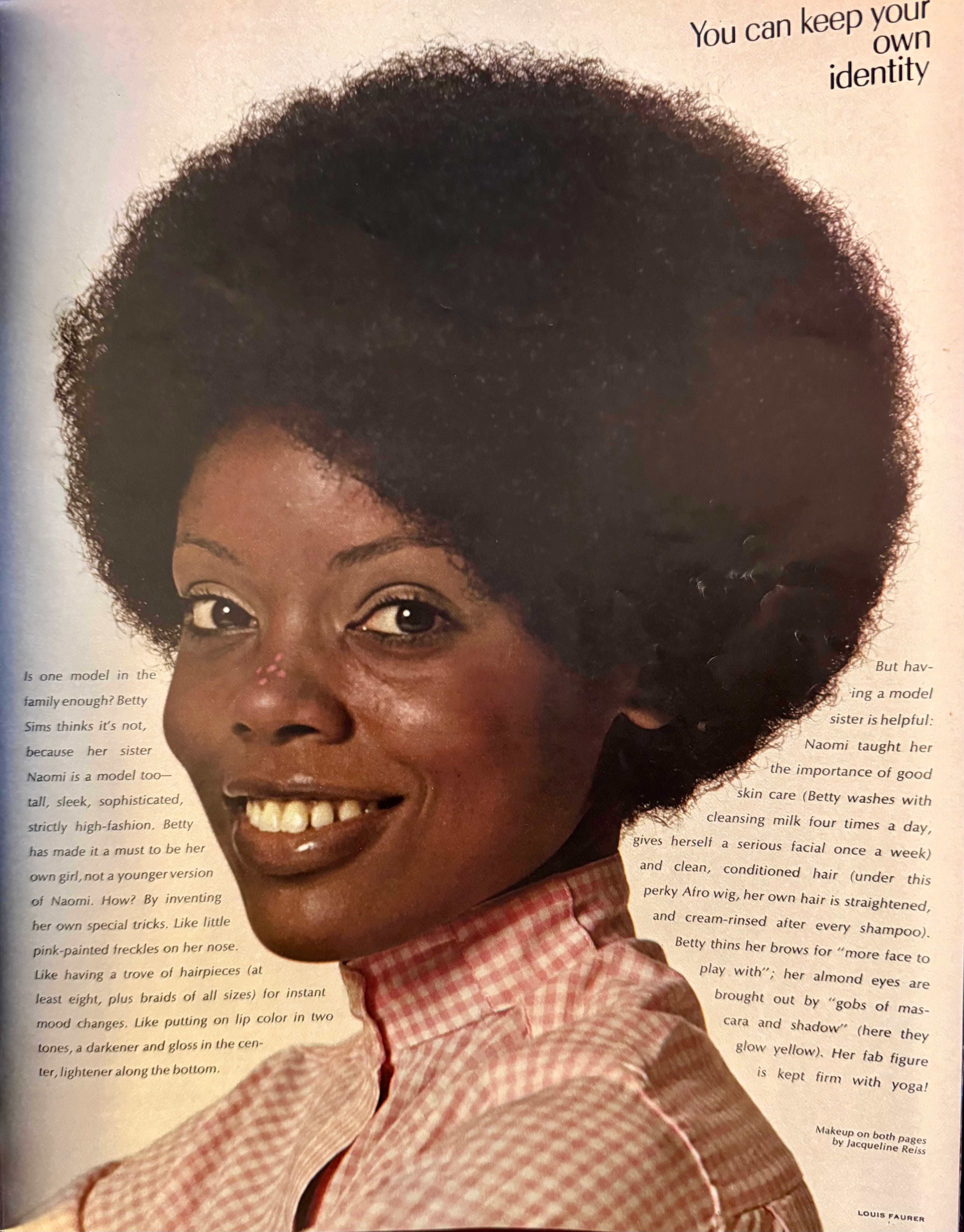Betty Sims, the model on this page, is the older sister of Naomi Sims, one of the first Black supermodels in America. Naomi and Betty were born in Oxford, Mississippi, and their paths took them to Pittsburgh then New York City. Both survived trauma and hardship along the way, and both became iconic role models for generations of Black girls and women.
