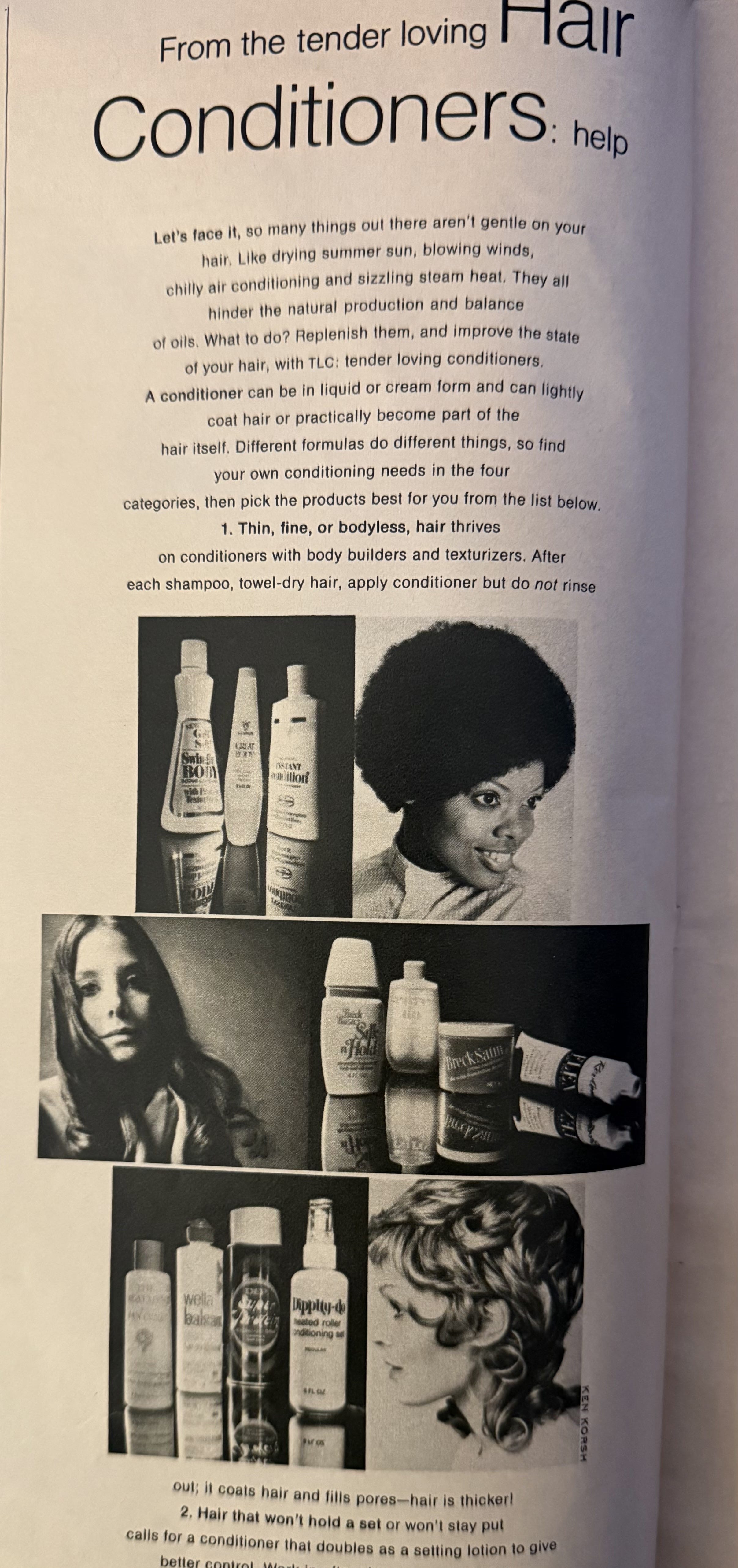 An editorial article about hair products includes a Black model, possibly Donyale Luna.