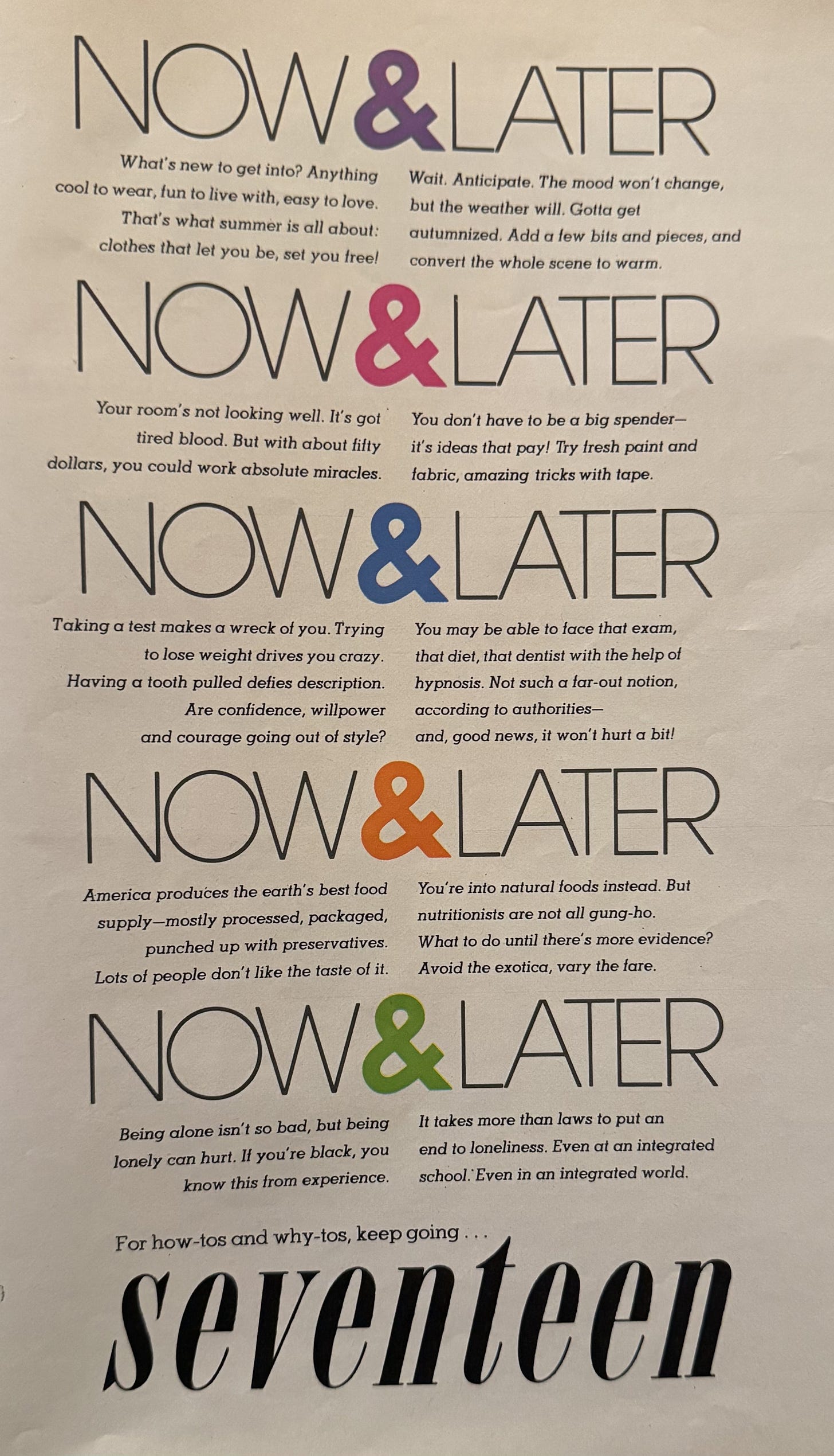 The racial divide is addressed in the final NOW, as “Being alone isn’t so bad, but being lonely can hurt. If you’re black, you know this from experience.” A mouthful. And the LATER keeps things real. “It takes more than laws to put an end to loneliness. Even in an integrated school. Even in an integrated world.”